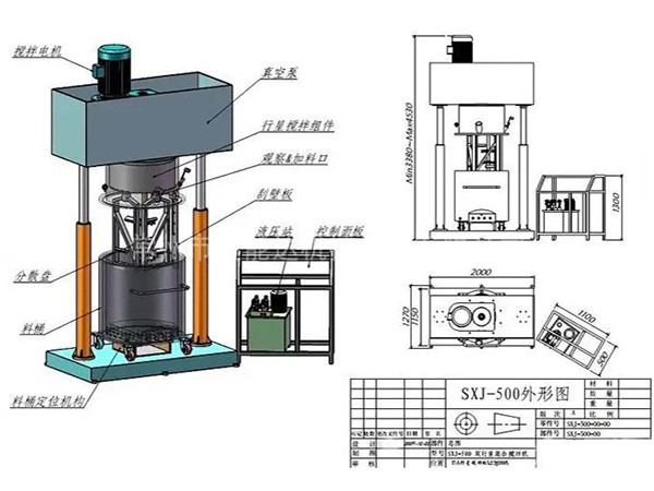 雙行星混合攪拌機(jī)是一種對(duì)多種液體、粉體進(jìn)行混合攪拌、溶解、分散、均質(zhì)的攪拌設(shè)備,分為減速電機(jī)、封蓋、行星架,高速、低速、活動(dòng)刮板三軸,刮壁器、料桶、雙柱液壓升降系統(tǒng)、真空系統(tǒng)以及機(jī)架等構(gòu)成。雙行星混合攪拌機(jī)能在真空下工作,可不斷的排出水分和其他的揮發(fā)物,因此,可作為脫氣釜使用。料桶可根據(jù)需要采用油、水循環(huán)加熱或冷卻;也可使用蒸汽加熱。加熱溫度通過(guò)控制面板上的溫度控制儀顯示。行星分散混合機(jī)(行星攪拌機(jī))廣泛應(yīng)用于高粘度電池、涂料、有機(jī)硅膠、油墨、染料、粘膠劑等。